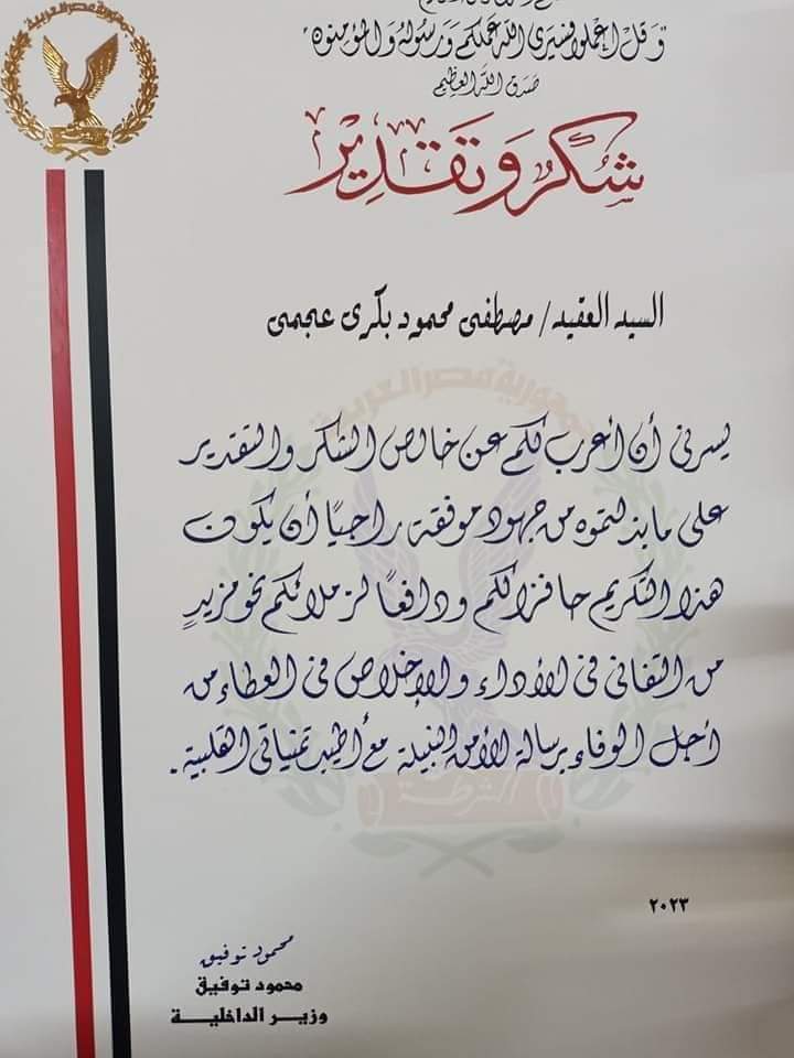 كرم اللواء محمود توفيق وزير الداخلية العقيد مصطفى محمود بكري حمد وكيل فرع البحث الجنائي بجنوب سوهاج وأكد الوزير ان التكريم جاء نتيجة اخلاصه في العمل وعلى مابذ له من جهود موفقة وقال إن هذا التكريم أتى حافزا له ودافعا قويا لزملائه لتقديم مزيد من العمل تنفيذا لخدمة الشعب وحفظ الأمن