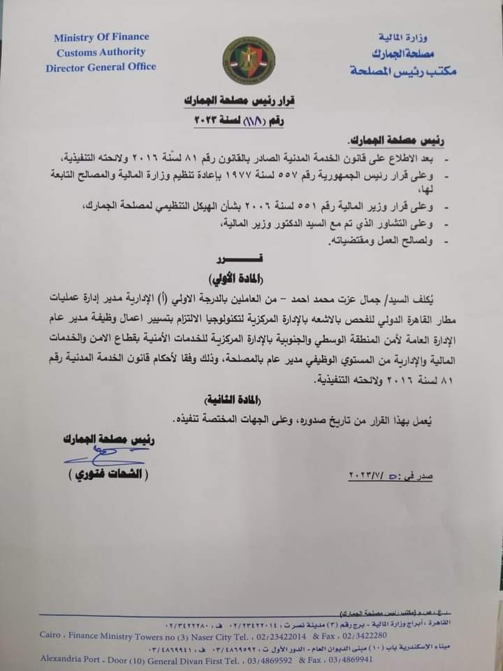* اصدر الشحات غتوري ،، رئيس مصلحه الجمارك المصريه ،، القرار رقم ١١٨ لسنه ٢٠٢٣ بتاريخ ٥/ ٧ / ٢٠٢٣ . بتكليف السيد الاستاذ / جمال عزت النمر من العاملين بالدرجه الاولي (أ) بتسيير أعمال وظيفه مدير عام الاداره العامه لامن المنطقه الوسطي والجنوبيه بالاداره المركزيه للخدمات الامنيه بقطاع الامن والخدمات الماليه والاداريه من المستوي الوظيفي مدير عام المصلحه . جدير بالذكر انه تدرج في المناصب ،،من مامورجمرك تفتيش الركاب التابع للاداره العامه لتفتيش الركاب بالاداره المركزيه لتفتيش الركاب بمطار القاهره الدولي . ،، ثم مامور جمرك تفتيش الفحص التابع للاداره العامه للعمليات بالاداره المركزيه لتكنولوجيا الالتزام ،، ثم رئيس قسم باداره تفتيش الفحص بالاداره العامه للعمليات بالاداره المركزيه لتكنولوجيا الالتزام ،، ثم مدير اداره تفتيش الفحص بالاداره العامه للعمليات بالاداره المركزيه لتكنولوجيا الالتزام . ،، واخرها انه كان يشغل منصب مدير اداره عمليات مطار القاهره الدولي للفحص بالاشعه بالاداره المركزيه لتكنولوجيا الالتزام والمشرف العام علي مطار سفنكس الدولي . ومطار العاصمه الاداريه الجديده حتي تم ترقيته الحاليه . * ومن جانب اخر تقدمت وحده الاعلام بمصلحه الجمارك المصريه بالتهاني له علي موقعها الرسمي . * ومن جانبه قدم الاستاذ / جمال عزت النمرالشكر والتقدير لكل من اعطانا الثقه وعلي راسهم السيد الاستاذ الدكتور / محمد معيط ''وزير الماليه '' والسيد الاستاذ/ الشحات الغتوري ''رئيس مصلحه الجمارك المصريه '' '' والسيد اللواء / ياسر الغزاوي '' رئيس الاداره المركزيه للخدمات الامنيه '' والسيد الاستاذ الدكتور / سعد سالم حمد '' رئيس الاداره المركزيه لتكنولوجيا الالتزام '' والسيد الدكتور / وليد حسين مدير عام المكتب الفني للسيد رئيس المصلحه '' والاستاذ/ صلاح محمد صلاح الدين مدير اداره المكتب الفني للسيد رئيس المصلحه * ولكل زملائي واخوتي بمصلحه الجمارك المصريه لدعمهم ومحبتهم وثقتهم الغاليه علي ترقيته. ** مدير عام امن الجمارك المصريه للمنطقه الوسطي والجنوبيه** وكل من قدم له التهاني